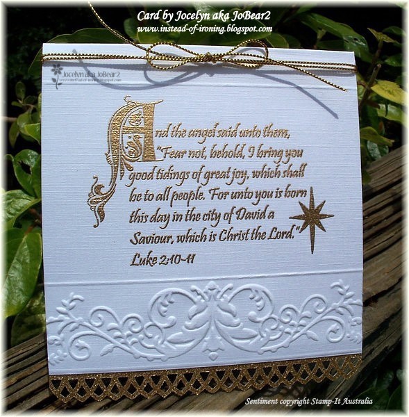 The image is from Stamp-It Australia called "The Angel Said" and was stamped with Versamark Watermark ink and heat-embossed it with Stamp-It Queens Gold embossing powder.